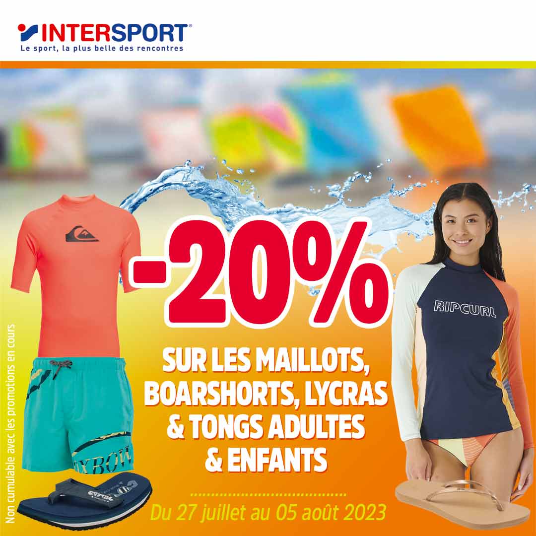 20% de remise sur les maillots, boardshorts, lycras et tongs, adultes et enfants, du 27/07 au 5/08/23. Offre non cumulable avec les promotions en cours.